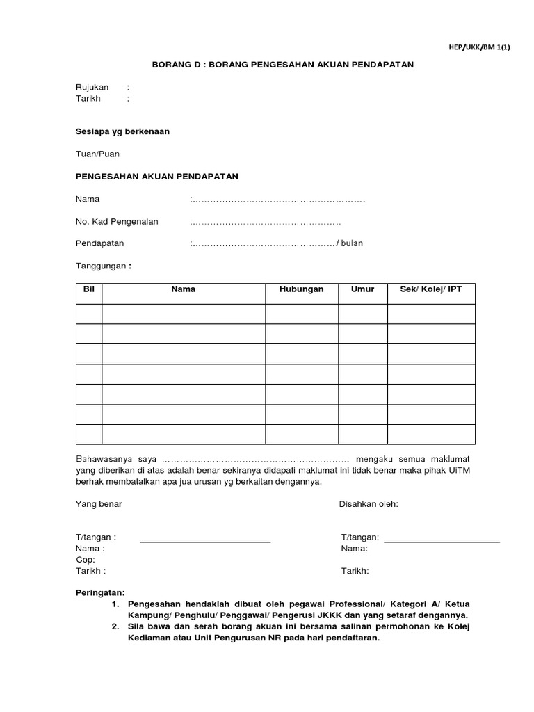 Assalamualaikum Bersama ini dilampirkan borang pengesahan akuan pendapatan bagi ibu bapa yang tidak mempunyai slip gaji atau bekerja sendiri. Bil Nama Hubungan Umur SekKolejIPT Bahawasanya saya _____ mengaku semua maklumat yang diberikan di atas adalah benar dan sekiranya didapati maklumat yang diberikan adalah. Sila bawa dan serah borang akuan ini bersama salinan permohonan ke Kolej Kediaman atau Unit Pengurusan NR pada hari pendaftaran.