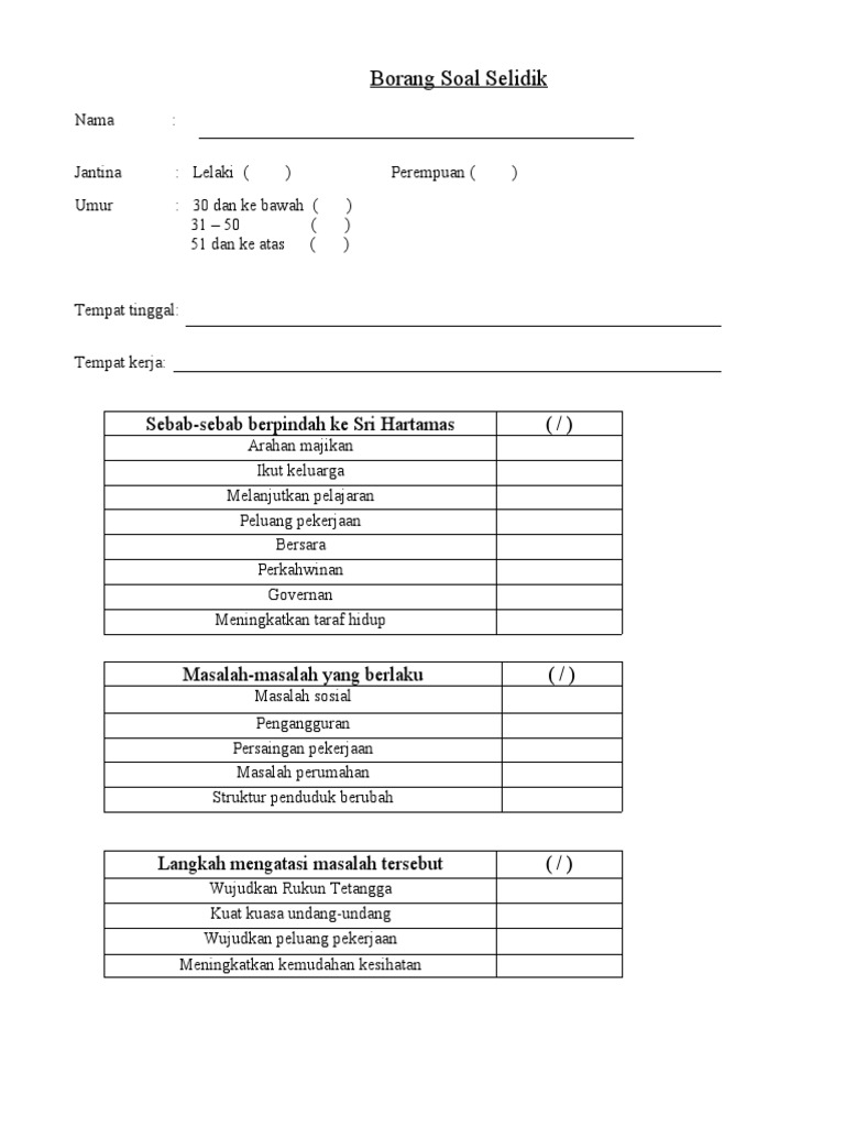 Contoh format borang soal selidik. Anda boleh menemuramah pemilik atau badan atau organisasi yang berkaitan dengan peristiwa bersejarah yang anda kaji. Segala maklumat yang diberikan dalam soal selidik ini adalah SULIT dan hanya digunakan untuk. Borang kaji atau soal selidik ini perlu dibuat dalam perlaksanaan dan disertakan dalam pelaporan tugasan wajib bagi Ujian Pelbagai Instrumen Geografi Pentaksiran Tingkatan 3 PT3 kajian lapangan atau lebih dikenali sebagai kerja kursus agar menjelaskan lagi hasil dapatan dan.