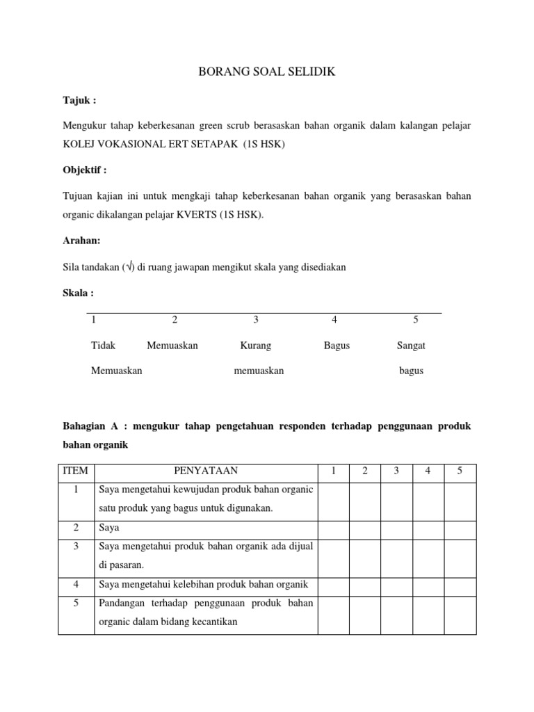 Produk makanan dan minuman tidak perlu berdaftar dengan KKM. Contoh soalan survey produkey contoh soalan survey produkt contoh soalan survey produk kecantikan contoh soalan survey produk wardah contoh soalan survey produk herbalife contoh soalan survey produk shaklee contoh soalan survey produksyon contoh soalan survey produksi contoh soalan survey kepuasan pelanggan contoh soalan upsr 2019 contoh soalan matematik tahun 3 contoh. BORANG SOAL SELIDIK BORANG SOAL SELIDIK ini dikemukakan untuk mendapatkan maklum balas dan menilai persepsi masyarakat Melayu di daerah Pengkalan Hulu Perak terhadap haiwan fasiq.