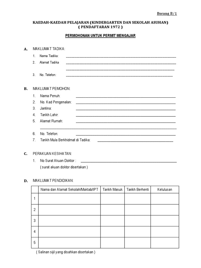 Borang Permohonan Permit Mengajar Tadika