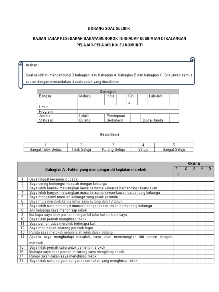 CONTOH BORANG SOAL SELIDIK 2021WORD PDFGeografi PT3Pelajar UniversitiProduk. Penemuan kajian ini amat berguna dalam membantu pihak pengurusan merancang dan melaksanakan program yang bersesuaian di masa hadapan. Hasil kajian konsep kajian merujuk buku teks tingkatan 1 konsep sisa domestik ialah sisa sisa yang terkumpul dan tidak menyelenggarakan.