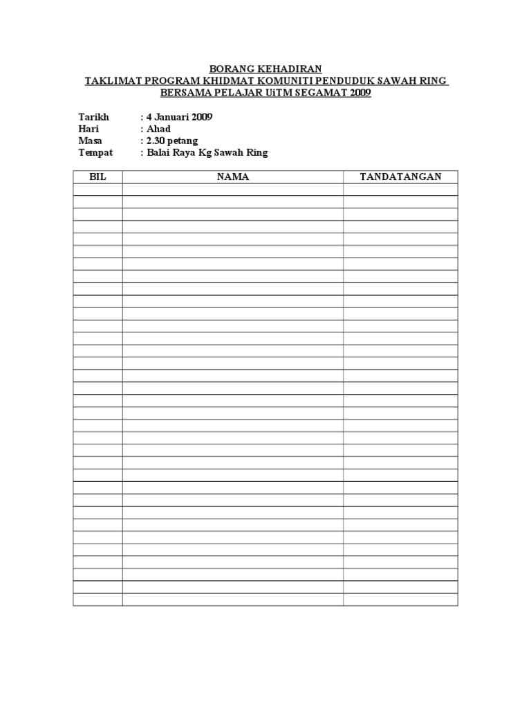 Borang Kehadiran Taklimat Program Khidmat Komuniti Penduduk Sawah Ring Bersama Pelajar Uitm Segamat 2009 Tarikh