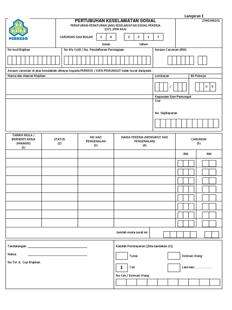 Satu borang hanya untuk satu jawatan sahaja. Audit Borang 5 Maklumat Auditor 9. 5 YEAR 2021 EMPLOYEES SOCIAL SECURITY ACT 1969 ACT 4 AND EMPLOYMENT INSURANCE SYSTEM ACT 2017 ACT 800 EXTENSION OF SOCIAL SECURITY COVERAGE TO DOMESTIC WORKERS PURPOSE This circular is to inform individuals who employ domestic workers that the workers will be covered under the Employees.