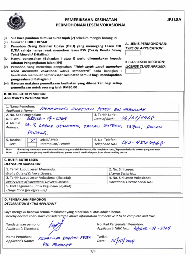 Borang Pemberitahuan Pindaan Butir-butir Lesen Memandu JPJ L7. 26 Jalan Tun Hussien Presint 4 Pusat Pentadbiran Kerajaan Persekutuan 62100 WP Putrajaya. Borang pemeriksaan kesihatan lesen vokasional19 pemeriksaan kesihatan permohonan lesen vokasional jpj l8a i sila baca panduan di muka surat tujuh 7 sebelum mengisi borang ini ii gunakan huruf besar iii pemohon orang kurang upaya oku hanya layak memohon lesen psv teksi kereta sewa teksi mewah e hailing.